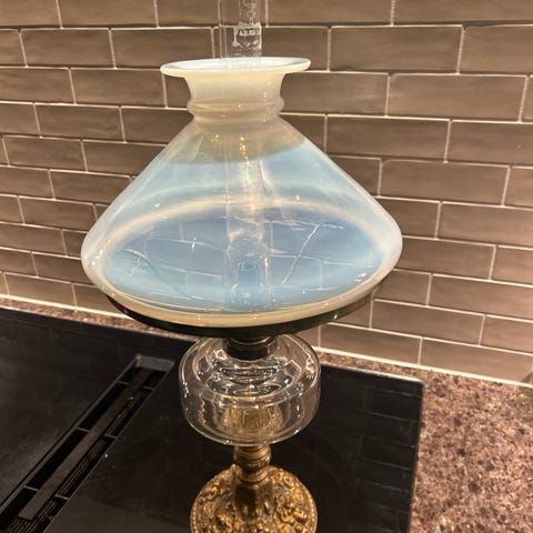 Antik petroleumslampe i glas med messingfod