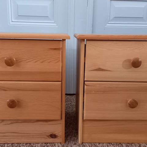 To pæne sengeborde fra Jysk. Det ene fremgår lidt mørkere end det andet - det er udelukkende pga. træets naturlige farve. Bordene står på fire slanke ben og har en enkelt skuffe med udskåret greb på forsiden. Træet har synlig årestruktur og en lys til medium naturtræfarve. Egnede som sengeborde i soveværelse eller som små sideborde i stue eller entré, hvor der er behov for en mindre opbevaringsløsning i skuffen og en plan bordplade til lampe eller andre mindre genstande.