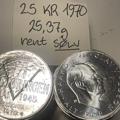 20 sølvmynter norge sælges samlet, rent sølvindhold 499,4 gram Spot + 5%