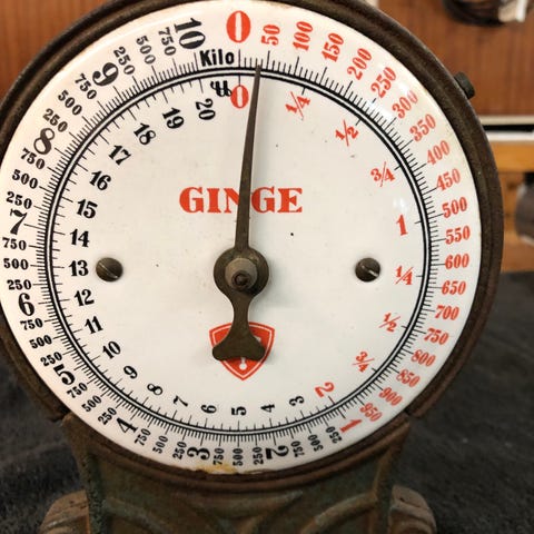 Mekanisk bordvægt i metal. Vægten har analog skala med gradueret måleområde angivet på buet skalaarm. Konstruktionen består af metalstel med tre ben og justerbar arm til vejning. Egnet som køkkenvægt, dekorativ genstand eller til lettere vejning af mindre genstande i hjemmet eller værkstedet.