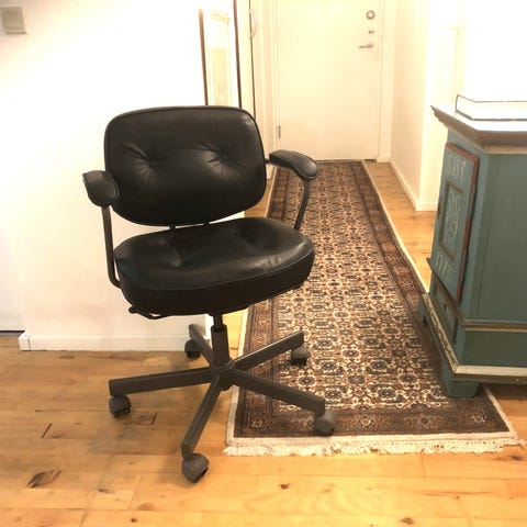 Alt på stolen fungerer som det skal og stolen har ganske få brugsspor. Puderne er læderet er vedligeholdt og i super stand.