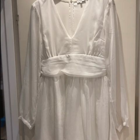 Hvid kjole i let stof af polyester. Ærmerne er trompet formede nedadtil. Elastik i taljen og udskæringen. Mærker er showpo fra Australien. Kan eventuelt prøves og afhentes i Skovlunde.