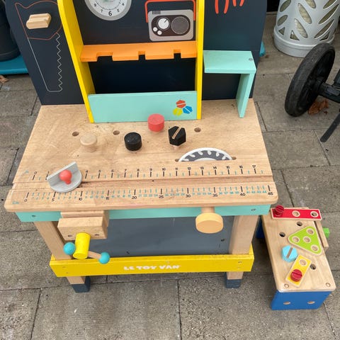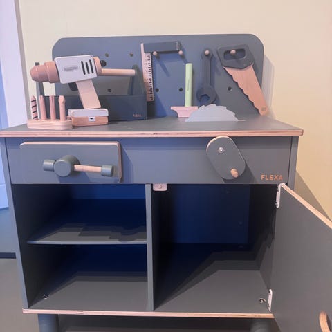 Flexa legeværksted til børn i træ i grå farve. Værkstedet har bordplade med udskåret rundsavselement og håndtag, samt hylde og skab til opbevaring. Øverst er der hulplade med knager til ophæng af legetøjsværktøj.
