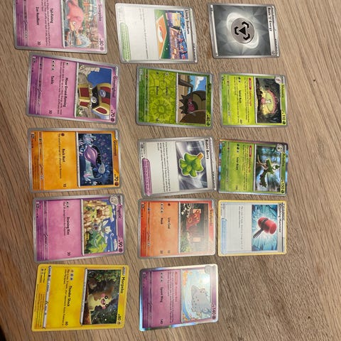 Pokémon samlekort blandet lot. Forskellige kort med både Pokémon, træner- og energikort i flere typer og farver. Kortene ligger løst og stammer fra forskellige serier og udvidelser. Velegnet til samling eller som ekstra kort til spil.