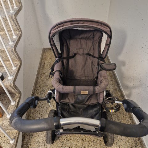 Barnevognsdelen har et smart håndtag, så man kan klikke delen af og bære hele liggedelen med indenfor, hvis barnet sover og man gerne vil have dem med op uden besvær.