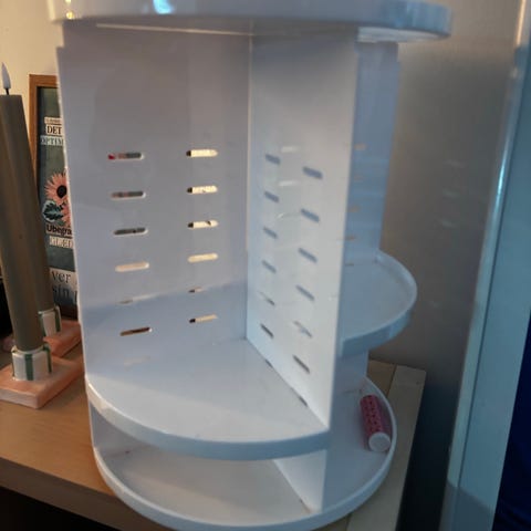 UNIQ 360° roterende kosmetik organizer i hvid plast. Egnet til opbevaring og organisering af makeup, hudpleje og andre små toiletartikler. Består af en roterende bundplade, øverste plade og justerbare sideplader med slidser til hylder. Leveres som samlesæt.