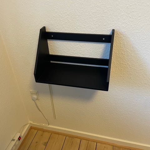 B5 hylde i eg fra FDB Møbler, designet af Børge Mogensen. Har været oppe og hænge i et par måneder, har ingen synlige brugsspor fraset ganske diskrete ridser på undersiden i det ene hjørne, som jeg ikke kunne fange med kameraet og som kun ses ved grundig inspektion.