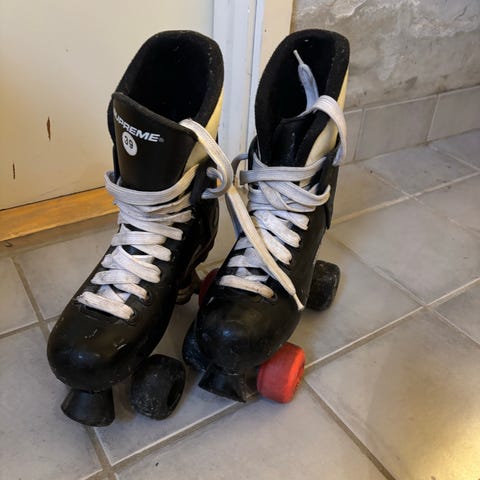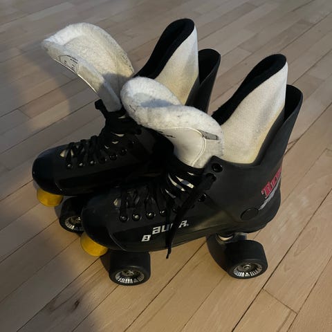 Bauer Supreme Turbo 33 rulleskøjter i størrelse 40. Klassiske quads med høj støvle, snørelukning og sorte hjul. Egnet til rulleskøjteløb på glatte underlag som fx indendørs gulve eller jævne udendørs overflader. Designet med støtte omkring anklen og hård ydre støvle for stabilitet under kørsel.