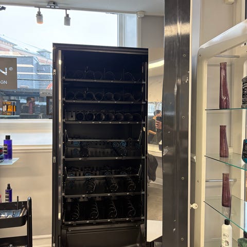 Automat salgsautomat med roterende hylder. Automaten har lodret, cylindrisk opbygning med flere gennemsigtige hylder, der roterer for at præsentere varerne. Betjeningspanelet er placeret i siden med display, knapper og møntindkast. Egnet til salg af snacks, drikkevarer eller andre mindre produkter i fx kontorer, kantiner eller fællesområder. Farverne er primært sort og hvid med gennemsigtige frontpaneler, så indholdet kan ses udefra.