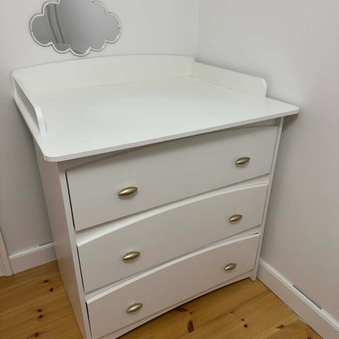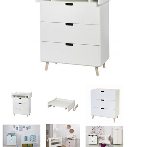 Vi har brugt det til to børn, som du kan se i skufferne. Bleer, sokker, undertøj og medicin øverst. Og så en skuffe til hvert barn. Vi har været meget glade for det, men nu bruger vi kun skufferne og ikke puslepladsen, da de er blevet for store. Der er ingen store hakker, mærker eller ridser udover lidt slidt nederst.