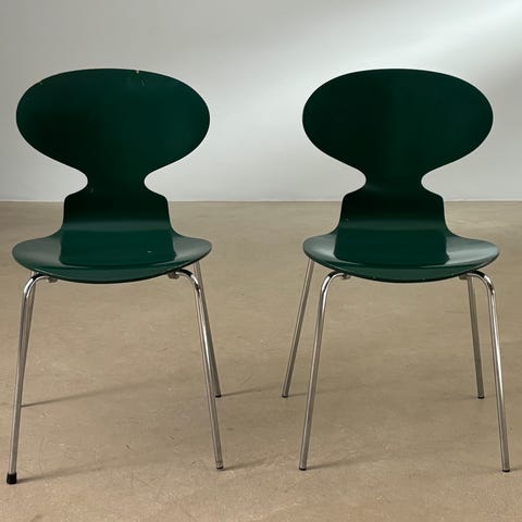 Klassiske “Myren”-stole i hvid – et af de mest ikoniske danske design fra 1952. og er siden blevet et internationalt symbol på dansk modernisme.