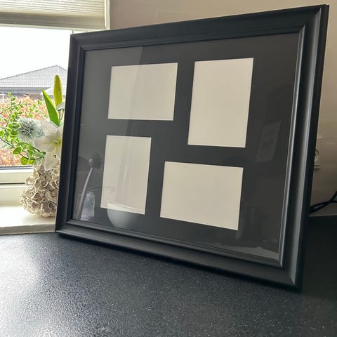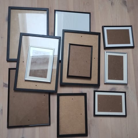 IKEA billedrammer sæt i sort. Sættet består af flere rektangulære rammer i forskellige størrelser, velegnet til fotos og plakater. Rammerne har en enkel, sort kant og hvid passepartout på de fleste af billederne. Egnet til ophængning som gallerivæg i stue, gang eller andre rum i hjemmet. Det er glas og trærammer