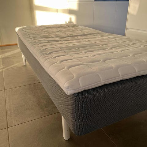 Jysk seng i grå tekstil. Sengen fremstår som en enkel boksseng med polstret gråt stofbetræk og hvid liggeflade/topmadras. Egnet som enkeltseng i soveværelse, gæsteværelse eller ungdomsværelse.konstruktionen er en polstret seng med fast ramme og aftagelig topdel som vist på billederne.