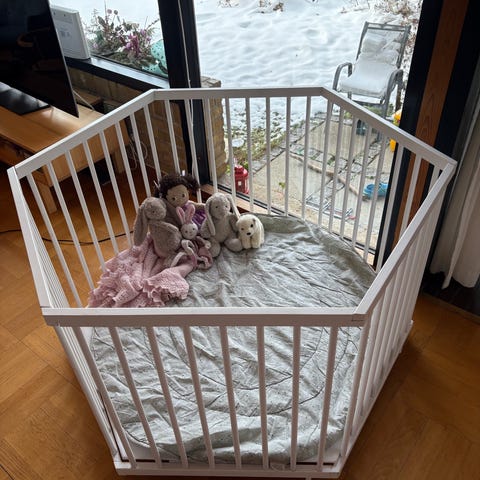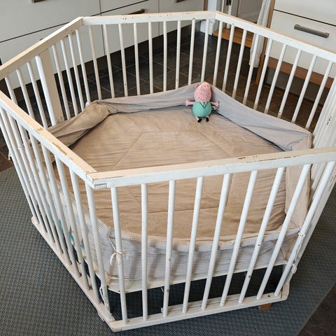 Grå kravlegård med tilhørende madras.
