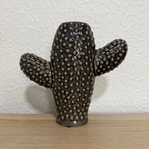 Vasen er formet som en kaktus med tre arme og en nubret overflade. Åben top gør den egnet til tørrede blomster, grene eller som dekorativt objekt i indretningen. Undersiden har filtpuder, som skåner underlaget.