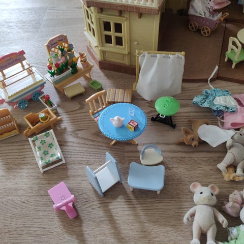 Samling af Sylvanian med en masse tilbehør. Mange forskellige dyr, et stort hus med møbler, en legeplads, en mindre hytte og en bil. Alt på billederne medfølger og er fint og intakt. Sælges samlet fra røg og dyrefrit hjem.