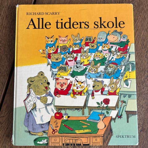 Richard Scarry Dyrenes godnat historier børnebog i hardback-udgave. Bogen er udgivet på dansk af Spektrum og indeholder illustrerede godnathistorier med forskellige dyrefigurer. Velegnet som højtlæsningsbog for børn med farverige tegninger på for- og bagside samt indeni.