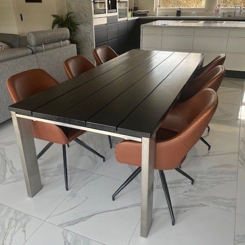 Plankebord fra Ilva med brugsspor, mørkbejdset.