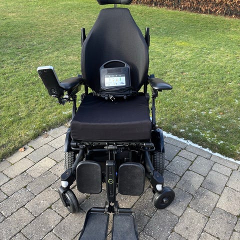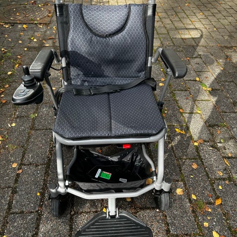 Invacare Kompas elektrisk kørestol i sammenklappeligt design. Kørestolen har polstret sæde og ryglæn, aftagelige fodstøtter og armlæn, samt små forhjul og større baghjul, der giver stabilitet ved indendørs og udendørs kørsel på jævnt underlag. Modellen kan klappes sammen for lettere transport og opbevaring. Velegnet til personer med behov for elektrisk mobilitetshjælpemiddel i hverdagen.