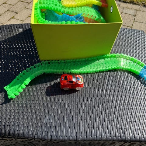 Super fin bane fra Flexi-Trax med mange muligheder for sammensætning. Der er forskellige funktioner til banen og en masse biler. - De skal alle have skiftet batteri og det er muligt, at der er nogle eller flere af dem, der ikke virker med batteri længere. Det er noget tid siden den var i brug sidst.