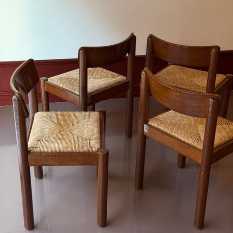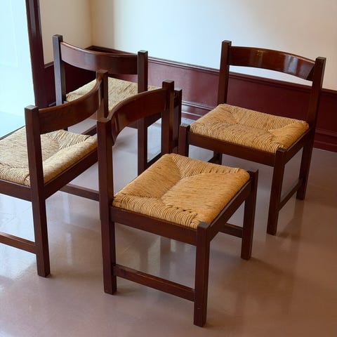 Set of four Campiglia Chairs by Vico Magistretti for Schiffini. Made in Italy, 1970s. A timeless aesthetic and handcrafted quality made from Italian ash wood with woven straw seats. H77 x W48 x D42 cmGood vintage condition. The seat is in good condition. The chairs have some general wear, marks, and scuffs consistent with its age.