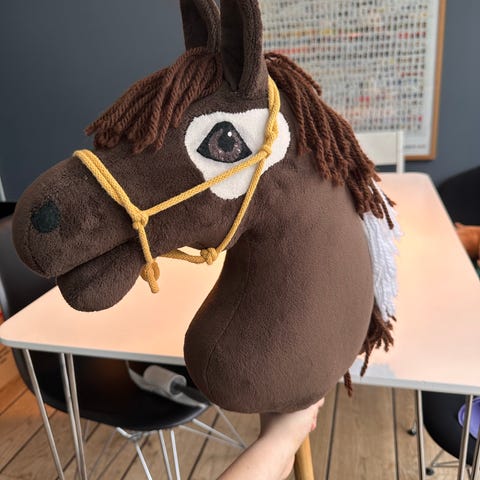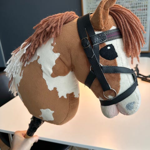 Kæphesten er håndsyet og unikt lavet i Finland, og er syet sammen i bunden, men kan selvfølgelig sagtens trævles op igen, så derfor medfølger ingen kæp. Den er i rigtig god stand selvom den er brugt, ingen huller eller pletter.
