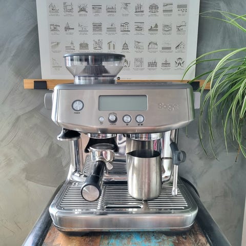 Sage Barista Pro i sort fra 2021 med integreret kværn. Maskinen er brugt meget lidt – jeg vil estimere, at jeg maks. har lavet 100 kopper på den, og jeg har udelukkende brugt filtreret vand. Den er vedligeholdt efter alle forskrifter med backflush og har aldrig været repareret.