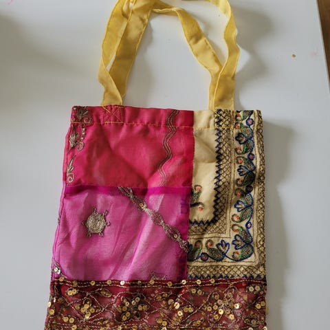 Indisk sari taske med justerbar bælte. Mål: 20 cm høj, 35 cm bred, 12 cm top.