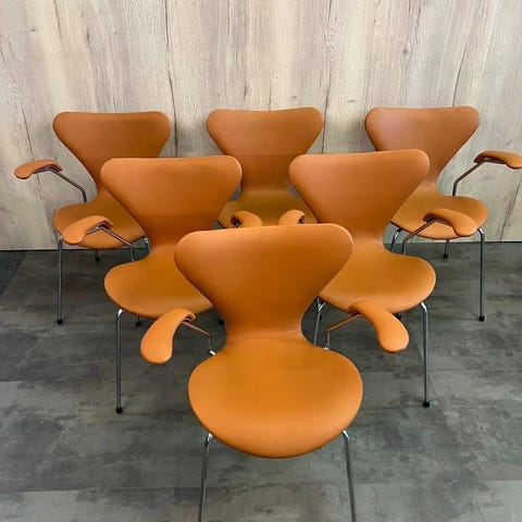 Originale Arne Jacobsen 7’er stole, originale fra Fritz Hansen, model 3207 med armlæn prof nypolstret i Cognac farvet semianilin læder, prisen er for 6 stk. Flere haves