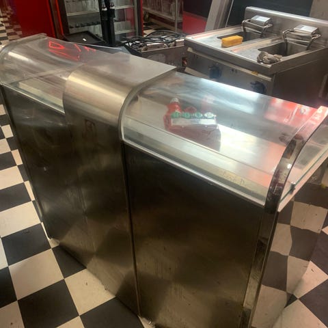 Retro køkken. I formet med reol 2 højskabe med plads til ovn og køl/frys. Bordpladen er en Keramik Bosco mat 12 mm. (Varmefast)