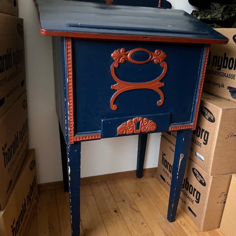 Et sjældent og charmerende møbel, der kombinerer praktisk opbevaring med dekorativt håndværk. Perfekt til dig der ønsker et unikt element i indretningen.