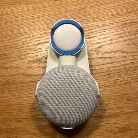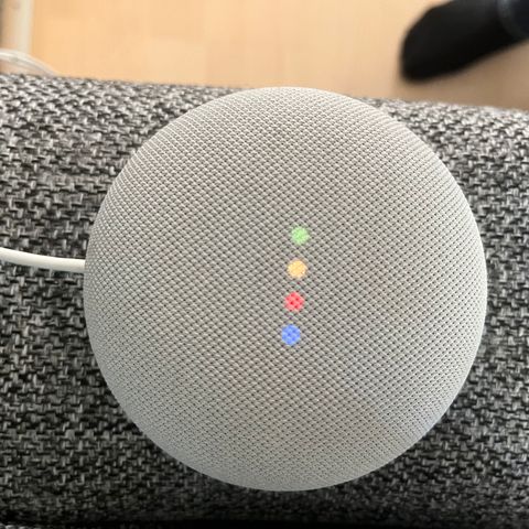Google Nest Mini smart højttaler i grå. Kompakt trådløs højttaler med integreret stemmestyring via Google Assistant. Enheden har touchkontrol på oversiden og indbyggede statuslys. Leveres med strømadapter og kabel som på billedet. Velegnet til afspilning af musik, styring af kompatible smart home-enheder og brug af stemmekommandoer i hjemmet.