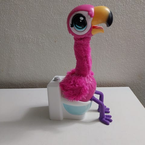 Sherbet er en Gotta Go Flamingo og en helt igennem sjov fugl! Denne interaktive, lyserøde Flamingo elsker at snakke, synge, danse, spise og gå på toilettet! Åbn Sherbets mund og giv ham hans magiske Flamingo Food med skeen. Se derefter hans lange hals bølge og bule, mens han gulper det i sig! Når han begynder at synge sin sjove sang, så ved du, at "Uh Oh He's Gotta Go!" Sæt ham hurtigt på det medfølgende gennemsigtige toilet og se ham lave fantastisk, magisk farverig bæ i den vandfyldte toiletskål! Når han er færdig, kan du hælde bæen tilbage i skeen! Den tørrer på magisk vis tilbage til Flamingo Food, så du kan made Sherbet igen og igen! Ud over at synge elsker Sherbet også at tale. Den optager det, du siger, og gentager det! Med sine sjove bevægelser, lyde og reaktioner vil Sherbert og Gotta Go Flamingo få alle til at grine.