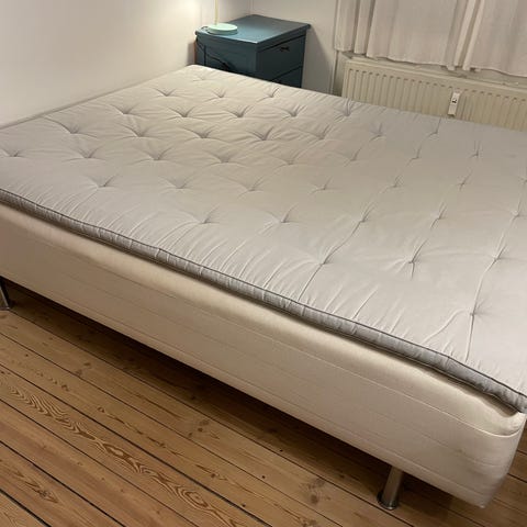 IKEA seng med madras i lys farve. Består af to boxmadrasser, der er sat sammen til en dobbeltseng, samt en topmadras øverst. Sengen står på ben og er velegnet som dobbeltseng i soveværelse eller gæsteværelse. Nærmere modelbetegnelse og mål er ikke oplyst. Sengen kan gratis afhentes på Østerbro frem til uge 8.