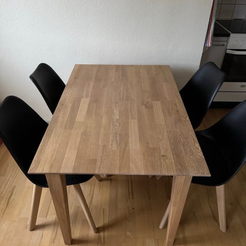 Spisebord plads til 4 stole, med udtræk plads til 6 stole.