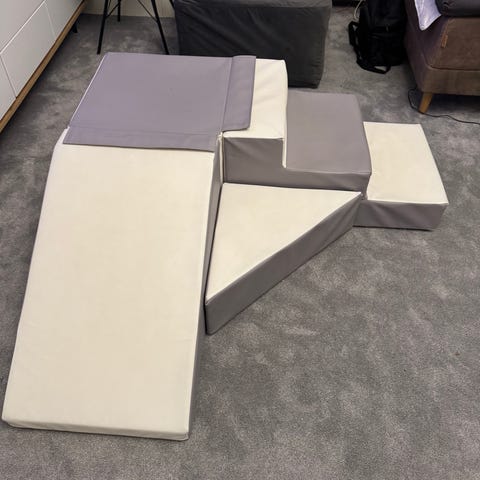 Sælger sæt af skummoduler til børn. Kan bruges som rutsjebane, klatre- og balancebane. Aftageligt betræk for nem rengøring, pænt holdt og ingen skader. Perfekt til børneværelse eller dagpleje.
