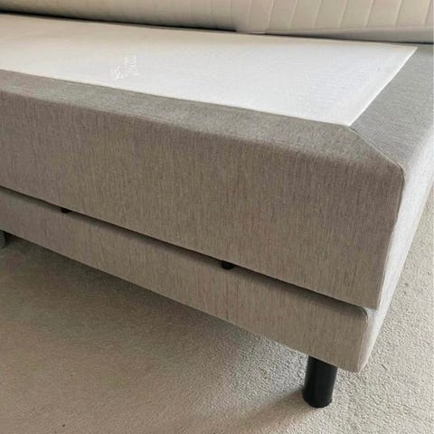Ilva elevationsseng i dobbeltudgave med hvid topmadras. Sengen består af to separate elevationsbunde, der kan justeres individuelt ved hjælp af fjernbetjening, som ses på billederne. Topmadrassen er hvid med quiltet overflade. Velegnet som dobbeltseng med individuel hæve-/sænkefunktion i hoved- og fodende. Yderrammen på sengene fremstår i mørk/blålig tekstilpolstring. Sengen er egnet til brug i soveværelse og giver mulighed for forskellige ligge- og siddepositioner.