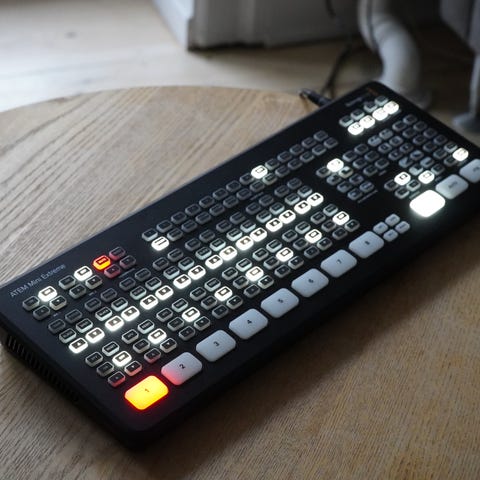 Frontpanelet har faders til lydmix, knapper til kildevalg og kontrol af billede mv.