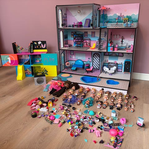 L.O.L. Surprise dukkehus med flere etager og farverige rum. Sættet omfatter forskellige L.O.L. Surprise dukker, møbler og små dele som stole, bord, seng, bil, kæledyr og diverse tilbehør.