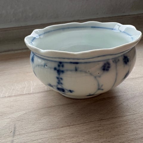 Superflot og dekorativ muslingeskål i hvidt porcelæn. Skålen fremstår i virkelig flot stand uden skader, patina eller slitage. Den har en smuk, ensartet hvid farve helt uden misfarvning.