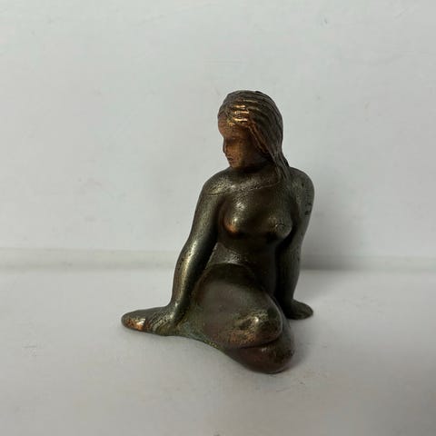 Elegant siddende kvindefigur i metal, inspireret af klassisk stil. Figuren sidder med benene ud til siden, venstre arm ført om bag hovedet, og højre arm hvilende lidt uden for kroppen, hvilket skaber et afslappet og elegant udtryk. Figuren minder i positur om Den Lille Havfrue i sidestilling.