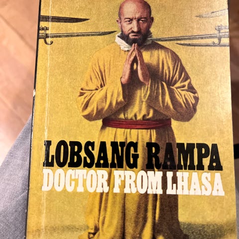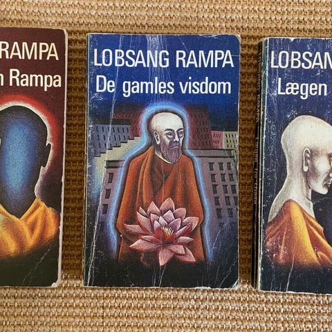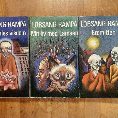 T. Lobsang Rampa "Det tredje øje" bog. Dansk udgave udgivet af Det Schønbergske Forlag i København 1958. Bogen er en selvbiografisk skildring af en tibetansk lama og beskriver blandt andet tibetansk klosterliv og spirituelle erfaringer. Teksten er på dansk og forsynet med forord af Jacob Paludan.