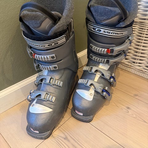 Salomon my custom fit skistøvler i sort og hvid med gul og beige indvendig foring. Støvlerne har flere justerbare spænder på fronten og powerstrap øverst for bedre pasform omkring underbenet. Inderstøvlen er polstret for komfort og varme. Leveres sammen med en sort taske, der kan bruges til opbevaring og transport af skistøvlerne. Velegnet til alpint skiløb.