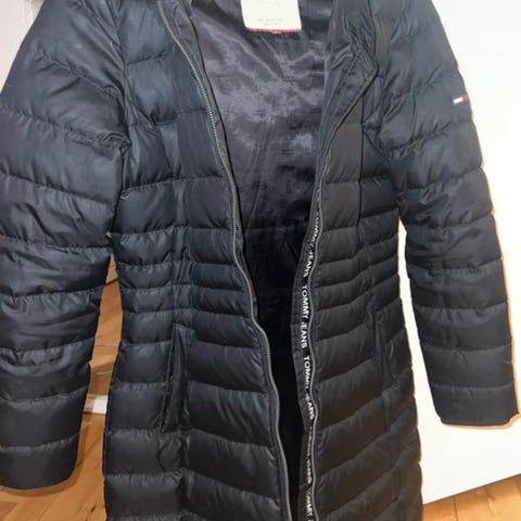Tommy Hilfiger vinterjakke i str. M. Lang, sort dunjakke med gennemgående lynlås foran. Jakken har hætte med pelskant og vandrette quiltede syninger. Fremstillet med dunfyld for isolering og varme i koldt vejr. Velegnet som yderjakke i vinterhalvåret.