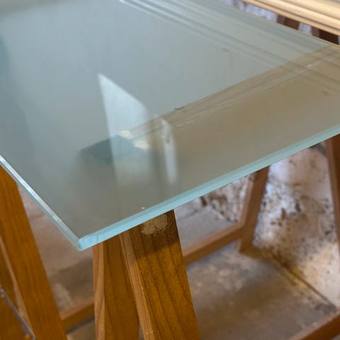 Glasplade 5mm tykkelse uden slebne kanter og små afslag et par steder.