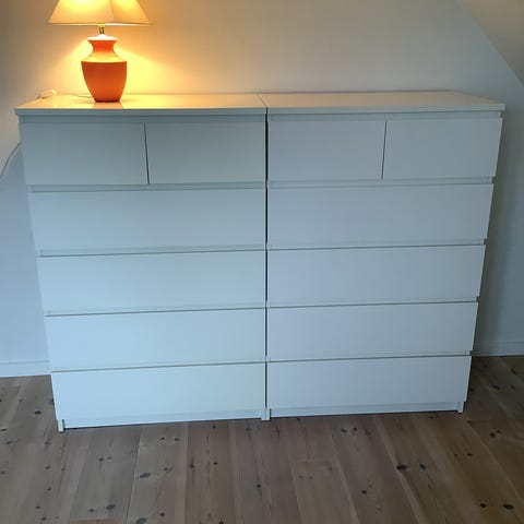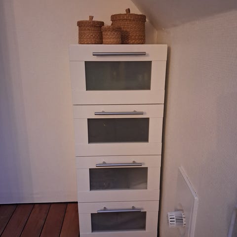 Kommode med 4 skuffer i hvid. Enkel, glat front uden greb og rektangulær topplade. Egnet til opbevaring i soveværelse, entre eller stue, f.eks. til tøj, tekstiler eller andre mindre genstande. Neutralt design, der passer ind i de fleste rum og indretningsstile.