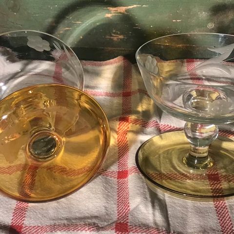 Glasset har fine blomster slibning og smuk ravgul fod.