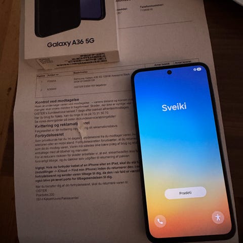 Samsung Galaxy A36 5G smartphone med 128 GB intern hukommelse. Modellen tilhører Galaxy A-serien og understøtter 5G-forbindelse. Telefonen har en sort front og bagside samt touchskærm med frontkamera i skærmens øverste midte. Bagsiden har flerlinset kamera med LED-blitz. Egnet til almindelig brug som opkald, beskeder, internet, apps og foto/video. Leveres med original æske som vist på billederne.