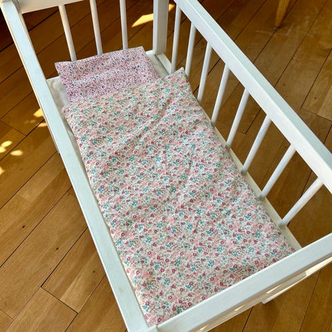 Charmerende vintage vugge til dukke, udført i træ med fin patinering. Malet i en skøn pastelgrøn farve med gyldne kanter, dekoreret med blade, blomster- og fuglemotiver. Kan også anvendes til opbevaring af legetøj, bøger mm. Mål: 57,5 x 32 x 18/26,5 cm.