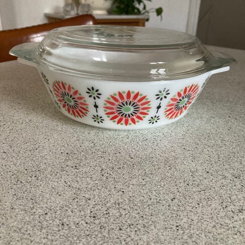 JAJ Pyrex str 28,5x18,5 fad med låg i glas. Rektangulært fad i hvidt glas med flerfarvet mønster på siderne og gennemsigtigt glaslåg. Egnet til brug i køkkenet til servering eller opbevaring af mad. Kan anvendes på bordet eller i køleskab efter behov, afhængigt af producentens anvisninger.